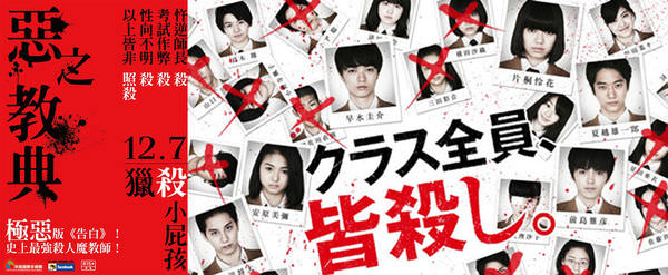 電影《惡之教典》在今年的日本是部很具話題性的鉅作,從宣傳到周邊都是用心經營:上映前有原著小說的漫畫版本開始連載,甚至也有前傳意味滿檔的日劇,透過手機無線電視BeeTV、分為四集提供給大家免費觀看(四集共兩小時的放送片長,早就是一部電影的長度,形同免費讓你看《惡之教典》的前傳序章,這麼有誠意,相信日本人會有不少人因此覺得賺到、然後自掏腰包進場看結局的);而在電影上映之後、則是積極利用各種媒體行銷方式,讓全日本處於幾乎無人不知《惡之教典》正在熱映的狀態之中。將映前與映後的電影話題性、都維持在高點,這是《惡之教典》很刻意卻誠意十足的宣傳手法。
