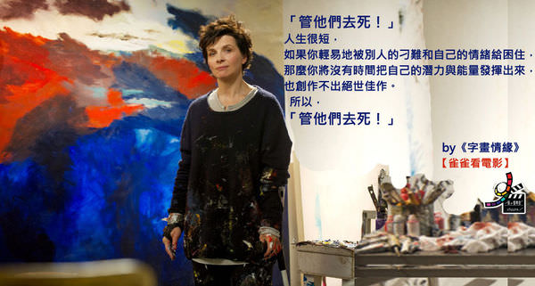 《字畫情緣》甚至最後讓音樂、舞蹈也進來電影裡面湊熱鬧(加上電影本身也是一種藝術形式),我相信茱麗葉畢諾許就是了解《字畫情緣》想要講的,不止「字」也不止「畫」,所以這位表演藝術家才要接戲演出一位和雷諾瓦一樣得到風濕性關節炎病痛的堅韌畫家。「痛」本身太難演,這的確也需要茱麗葉畢諾許的演技才能說服觀眾。